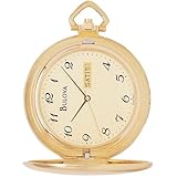 Keep time on your side with this men's pocket watch and knife set. Classic, refined lines in brushed and polished gold plate. Striking gold plated finish is on durable stainless steel. Handsome round case has a satin finished protective lidthat opens. easily at the crown. Raised, polished gold plated bezel frames the ivory colored dial with black sword hands, a sweeping second hand and Arabic numeral hour markers. A window at the 3 o'clock hour reveals the bilingual day/date calendar. Attractive, 12 inch gold plated chain adds convenience and attaches to the practical pocket knife. Precise quartz movement. Case is 42.5mm diameter, 8.5mm thick