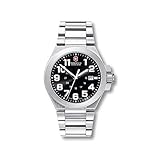 Stainless steel case and bracelet. Black dial. Date displays at 3 o'clock position. Mineral crystal. Quartz movement. Water resistant at 100 meters (330 feet).