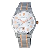 Rose-gold and silver tones combine to give the #V251324 Victorinox Swiss Army Men's Alliance Watch a luxurious, adventure-ready look. This classic timepiece features a silver-tone dial with rose-gold Arabic numeral indexes, small black Arabic numerals for tracking 24-hour time, a trim second tracker on the flange, and three luminous, easy-to-ready hands. A silver-tone stainless steel bezel complements the dial, while a 40-millimeter stainless steel case gives the watch a well-balanced feel. A silver-tone stainless steel bracelet band with trim rose-gold accents between the links and a textured rose-gold tone crown complete this watch's sophisticated look. A scratch-resistant sapphire crystal with an anti-reflective finish protects the watch face and helps ensure easy-reference, while a deployment-clasp-with-push-button holds the watch securely in place during work and play. This Alliance series watch is powered by precise, Swiss-quartz movement and is water resistant to 330 feet (100 meters).