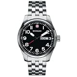 From the maker of the genuine Swiss Army Knife comes this large-sized, classically styled Wenger AeroGraph men's stainless steel military watch. This large, round watch case measures 45mm wide (1.77 inches) and it's topped by a raised bezel with a polished finish. The black dial face offers a full Arabic numeral display in white as well as small minute indexes, oversized luminous hands (with red seconds hand), and a day-and-date window at 3 o'clock. It's completed by a distinctive quintuple-link stainless steel bracelet band that's joined by a diver's buckle and safety clasp. Other features include the classic Swiss Army insignia at 12 o'clock, a scratch-resistant mineral crystal, and water-resistance to 100 meters (330 feet)--suitable for a variety of snow and water sports.